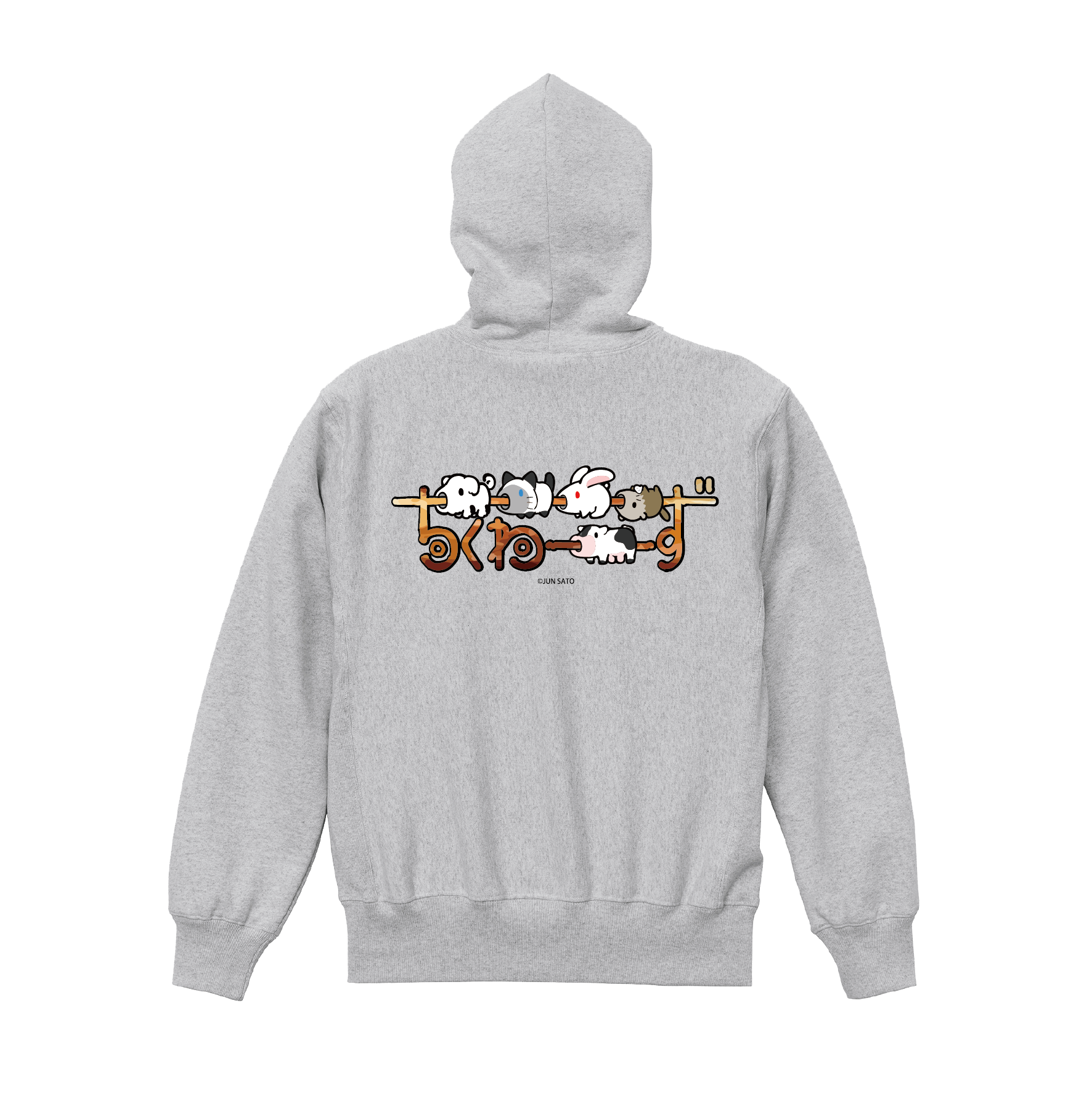 ちくわーずパーカー2023Aは、裏起毛で暖かく、アッシュカラーがおしゃれな一枚です。前面背面の両面プリントで、かわいく仕上がっております。